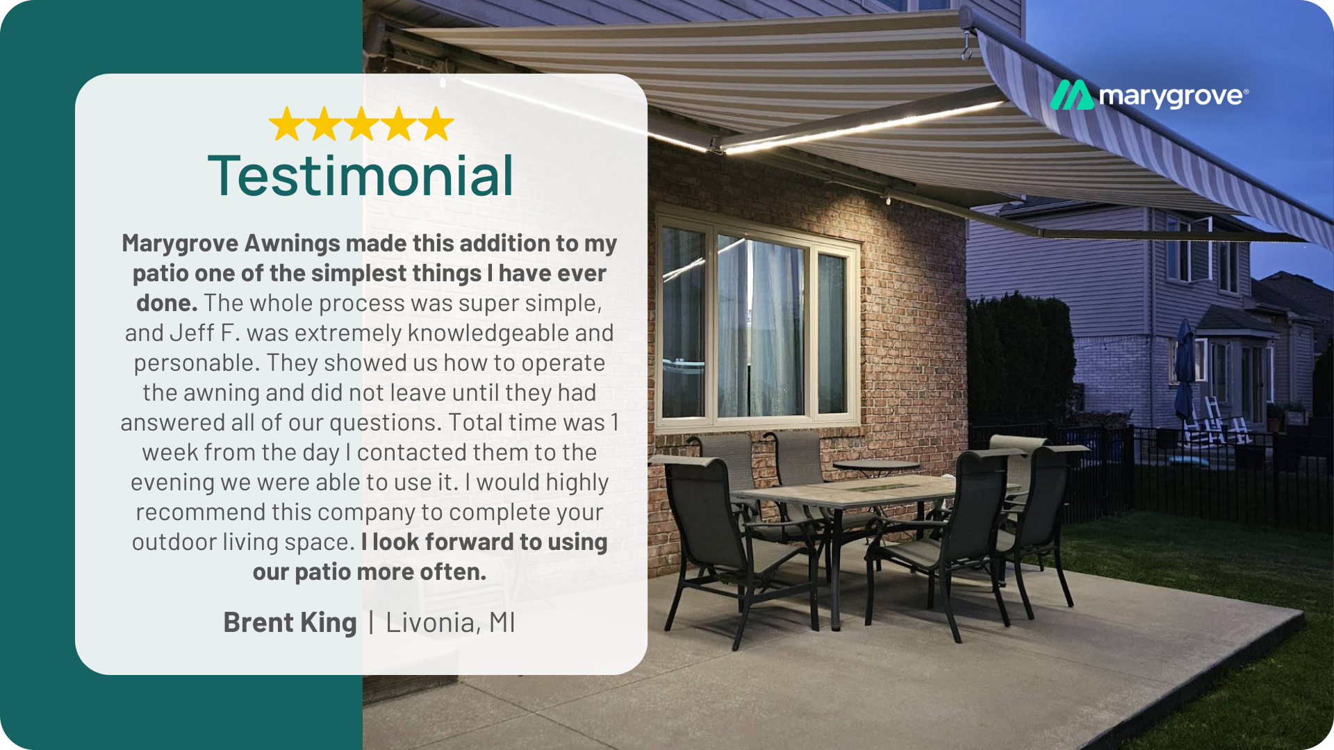 Because Marygrove stocks popular awning sizes and styles, installation timelines are often much shorter than made-to-order brands.
