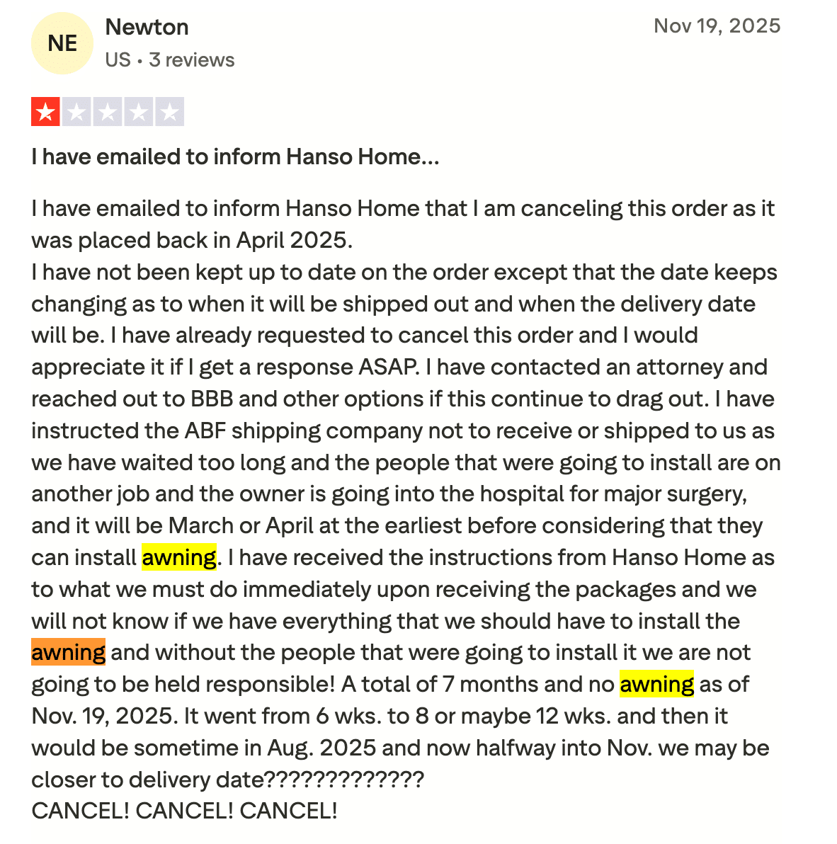 One of the most common complaints about Hanso involves delivery delays. Customers on the BBB and Trustpilot report wait times of five to nine months past their original promised delivery date. In some cases, customers say the shipping company told them Hanso had not paid for delivery.